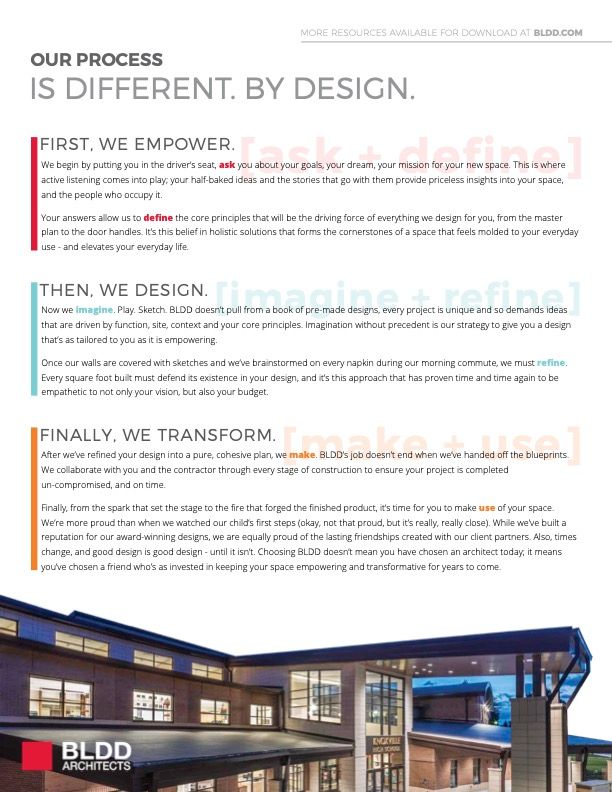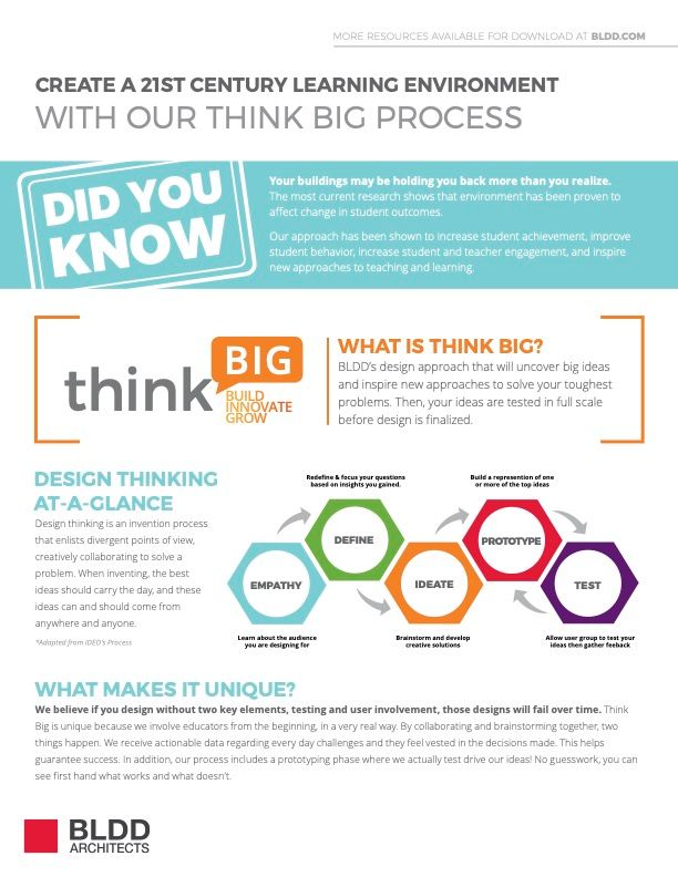 Working with hundreds of education clients since 1929, the architects at BLDD understand the struggles of adapting environments to the ever-evolving needs of learning. Here at BLDD, we start by Thinking BIG. Through our five-step design-thinking process, students, educators, administrators and architects collaborate as co-authors of a design.