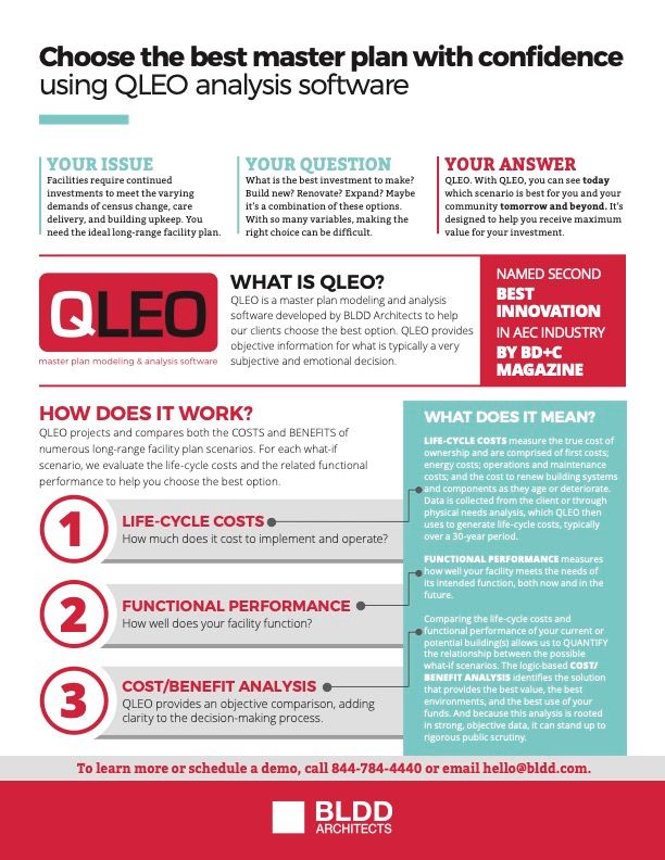 QLEO is a master plan modeling and analysis software, developed by BLDD Architects to help our clients choose the right option. QLEO provides objective information for what is typically a very subjective and emotional decision.