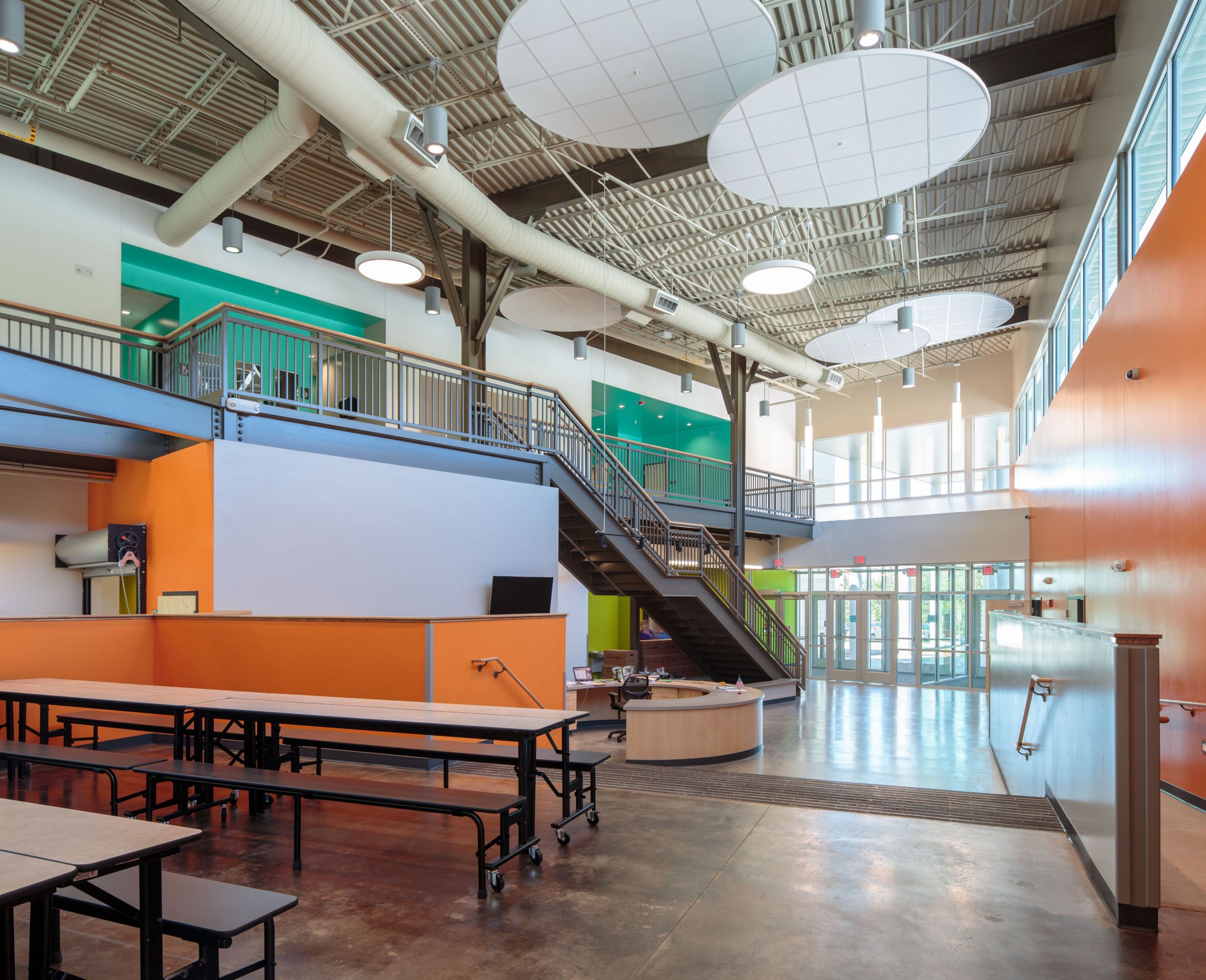 Traditional school spaces such as the library, cafeteria, stage, and lobby, had to be re-imagined to maximize their potential. This challenge was met by arranging three of the small learning community modules, as well as a unique module housing Kindergarten. Emotional, physical, and behavior development programs connect through a large 2-story flex studio.