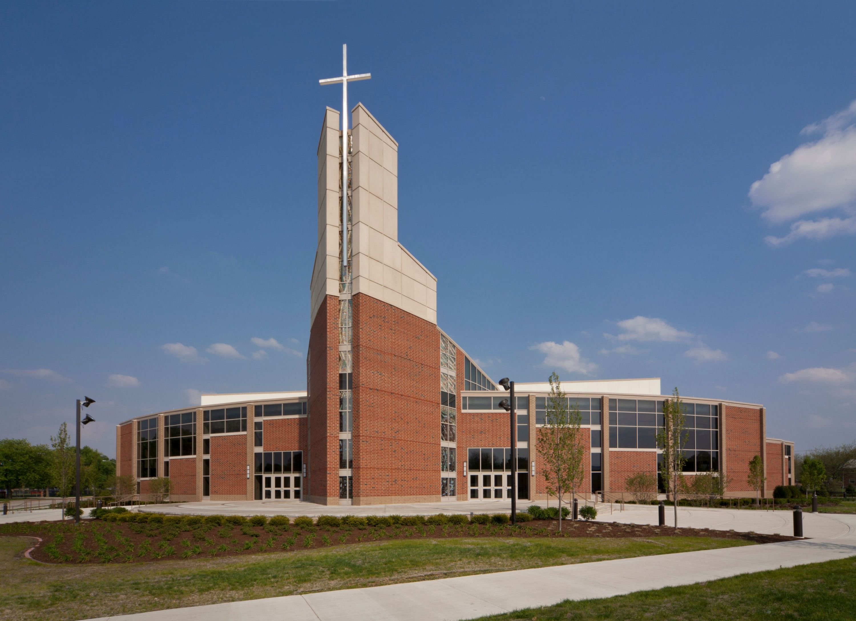 The two intersecting ovals that form the lobby and gathering space are a new rendition of the classical “crucifix” form. The stepped elements of the exterior façade create visual upward movement culminating in the tower cross which can be seen from all parts of the campus.