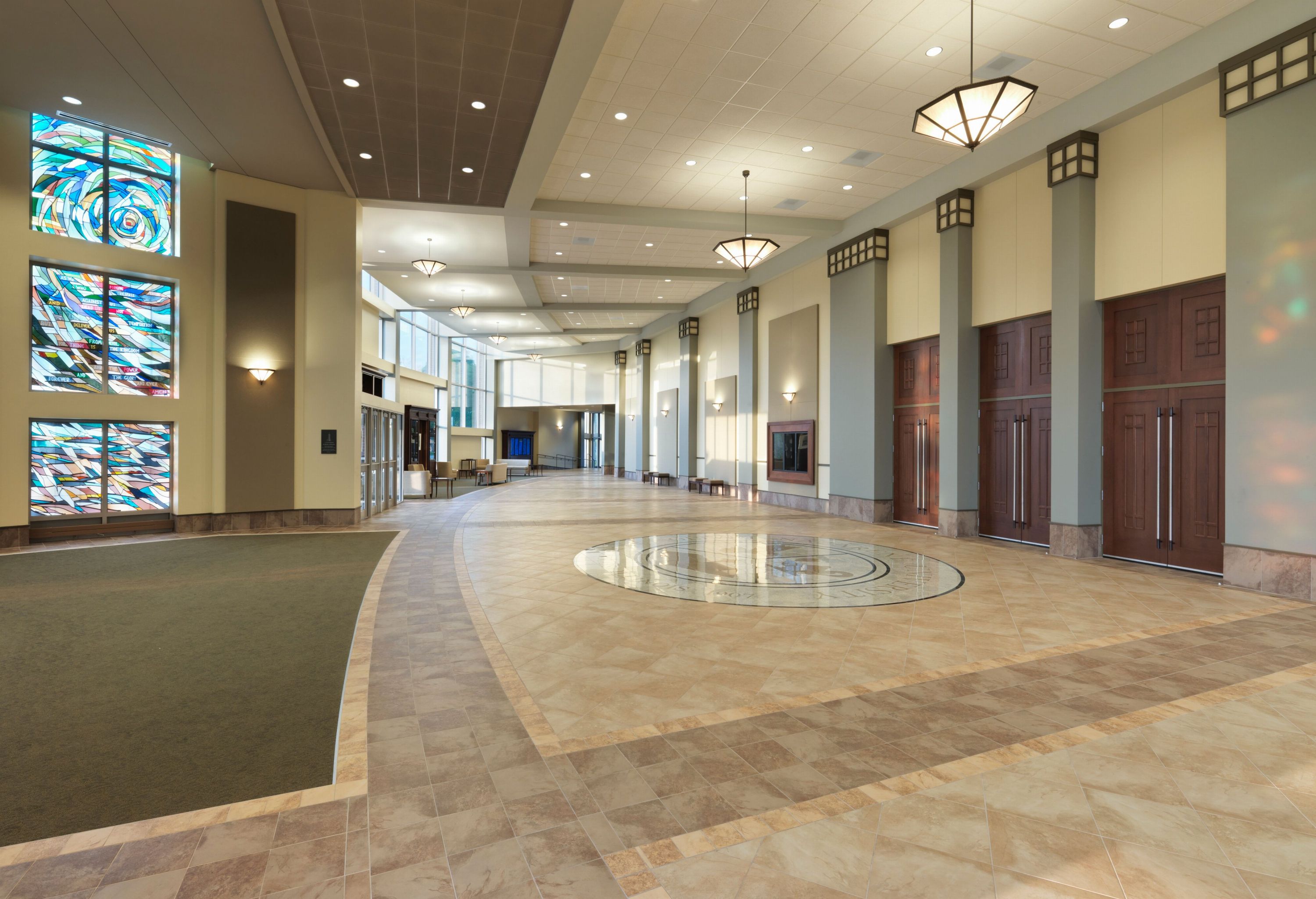 Soft curved lines can be found as a design feature in the exterior facade, the auditorium ceiling, the shaping of the 100-foot tower, the lines in the 80-foot stain glass window and the organ’s facade.