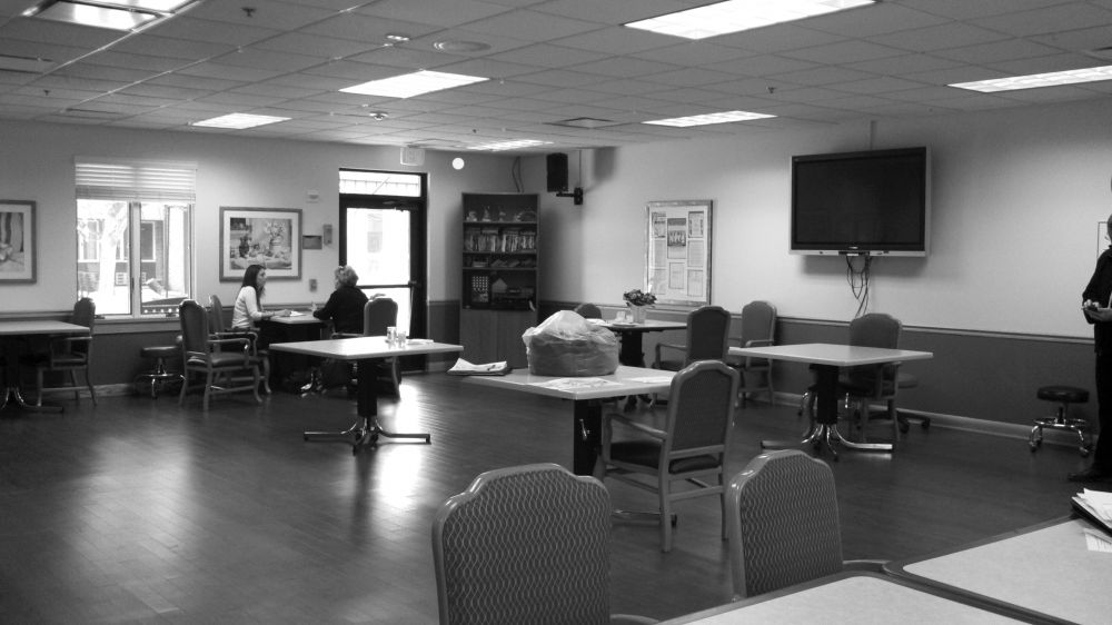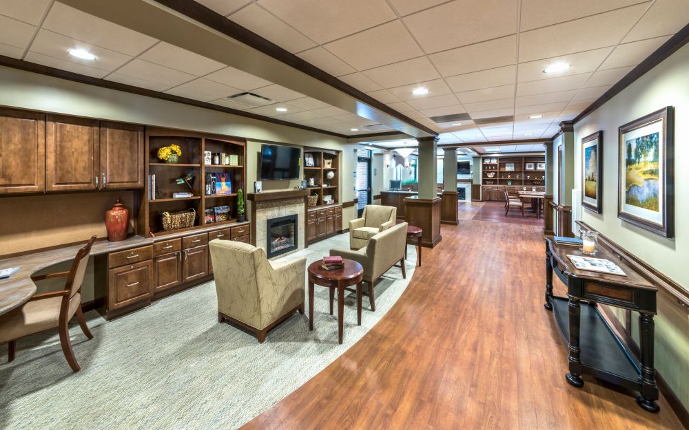 The short-term stay dining room was remodeled to reflect a more hospitality-like atmosphere and the physical therapy gym was expanded. Also, to ensure long-term care residents feel “at home,” their dining/activities room were renovated to include more intimate, residential aesthetics, and a new central family room space was created by capturing former office and clean linen rooms and opening them up to the corridor.
