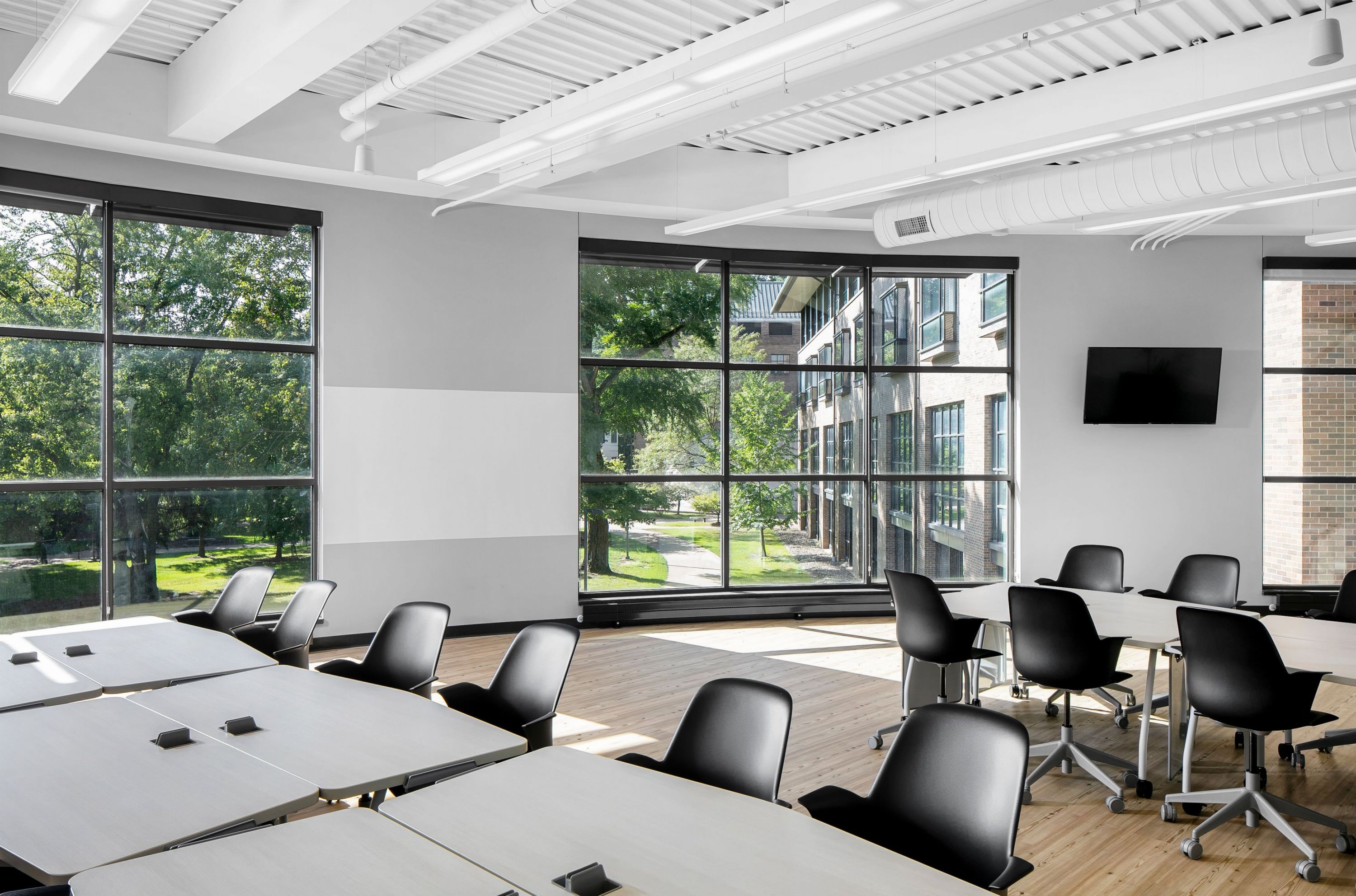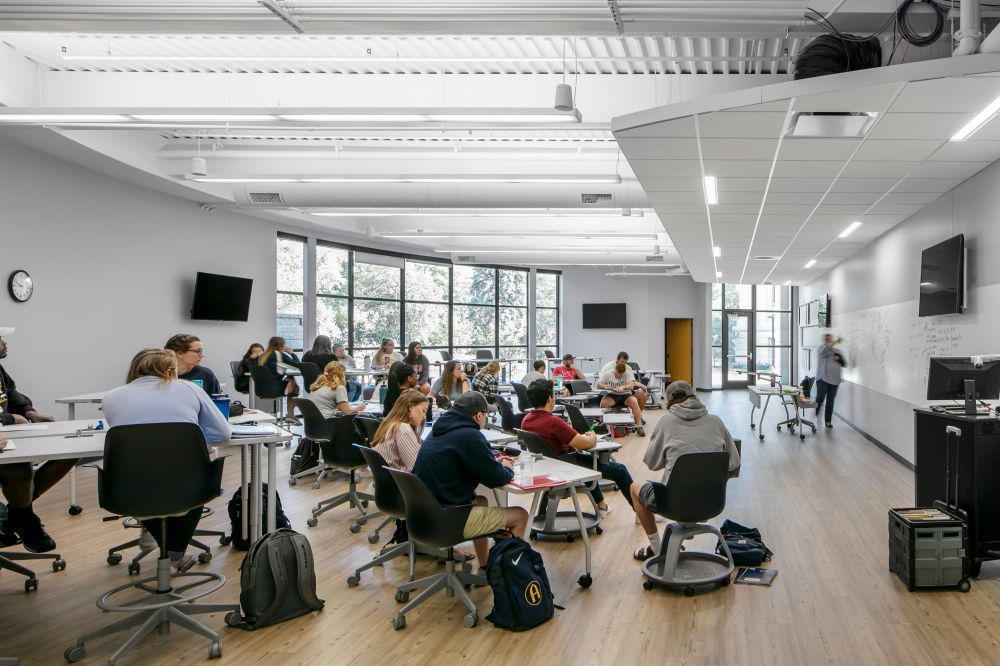 Lecture halls have whiteboard-painted walls and personal dry-erase boards on each desk.