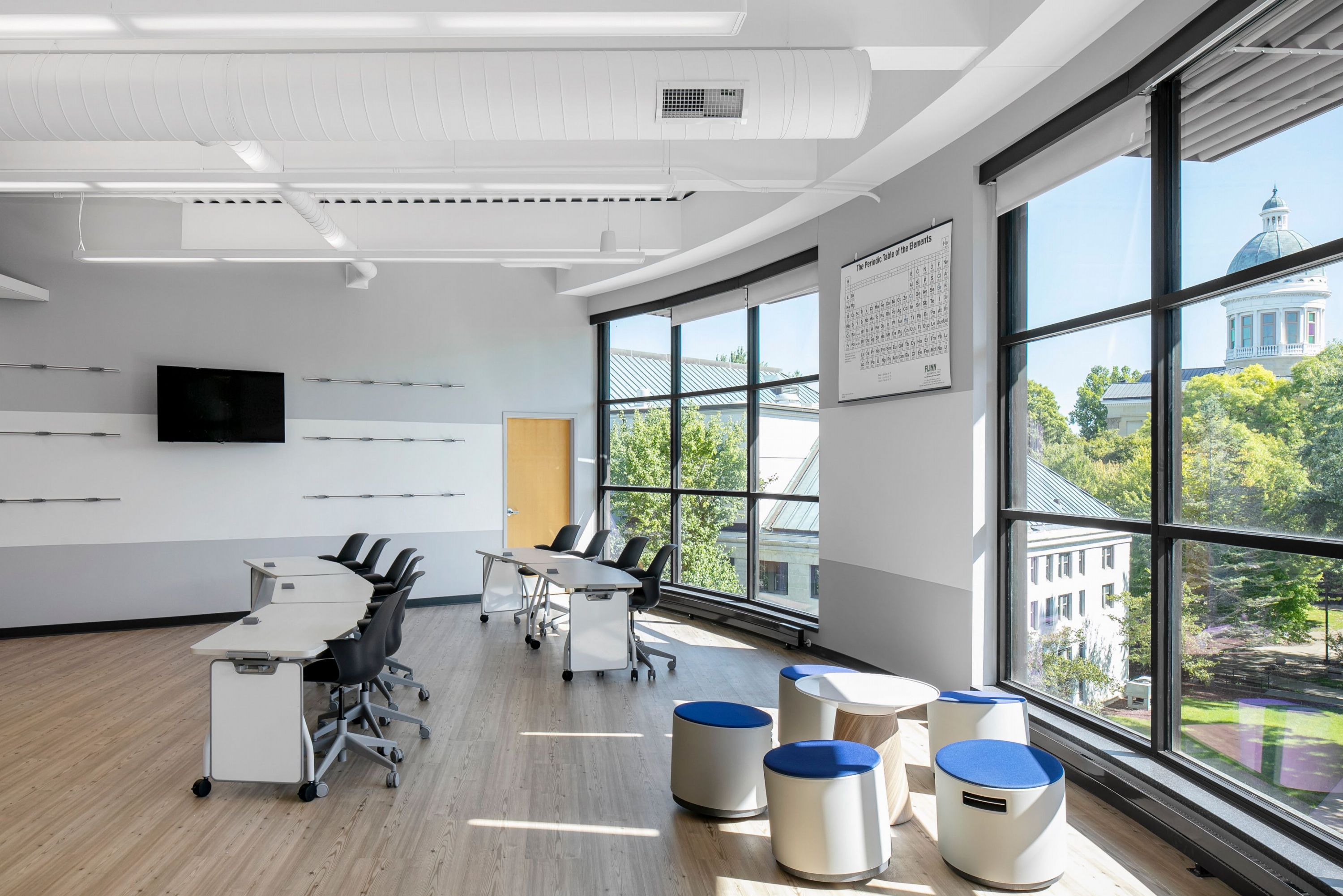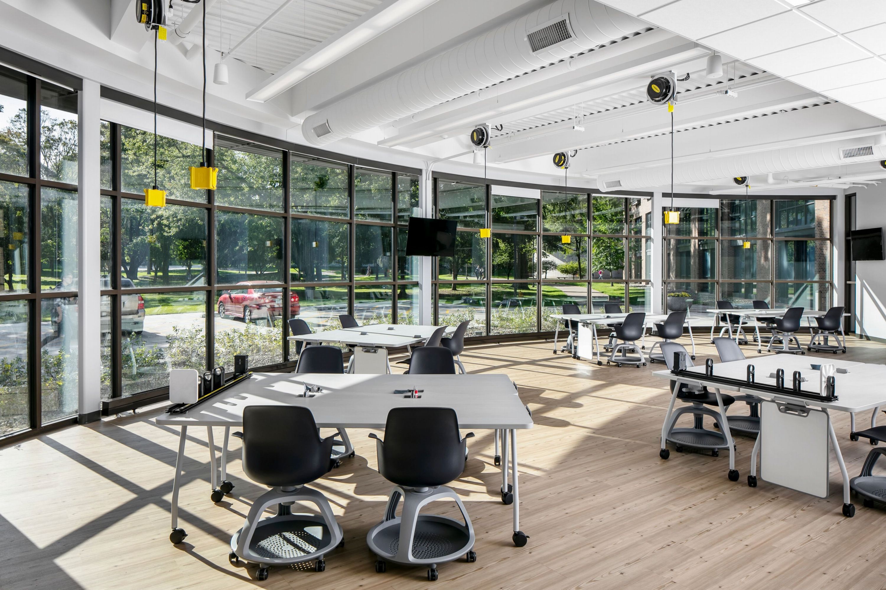 Tables and desks have wheels so they can be moved and rearranged.