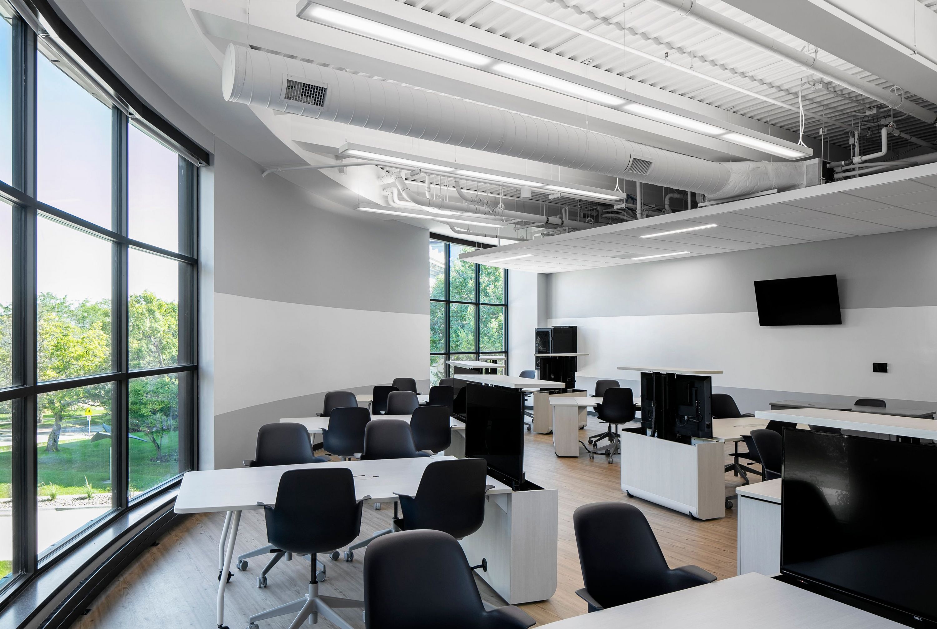 Classroom tabletops in the fourth-floor geospatial lab have pop-up monitors where students can screen videos or display work.
