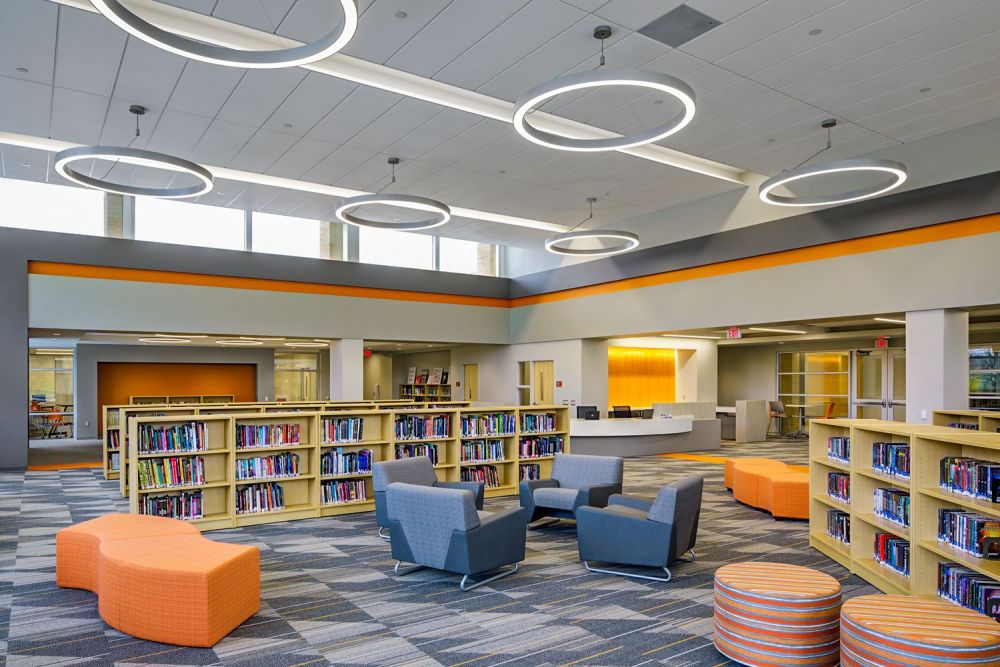 The renovation created an opportunity to open new collaboration spaces for students and educators. Future-focused spaces like the Information Commons offer students the ability to check out a variety of media in a flexible and comfortable environment. A section of the first and second stories was taken out to create the STEM zone—allowing those in STEM classes to break out of their academic silos and allow for more cross-curricular collaboration. Along with science and math classes, there are open spaces for robotics and engineering courses.