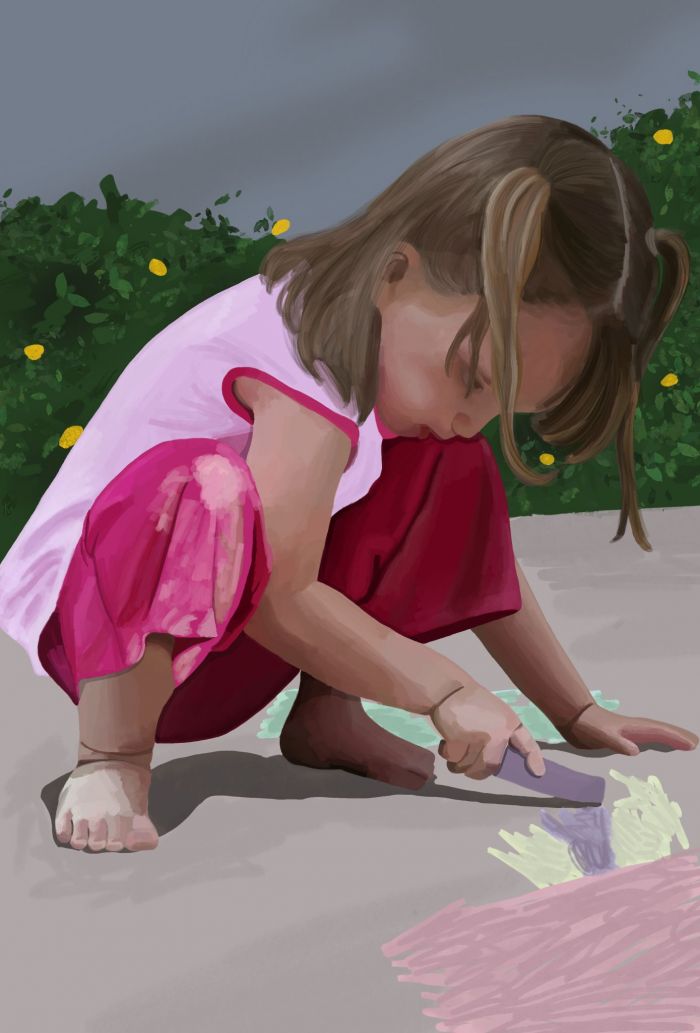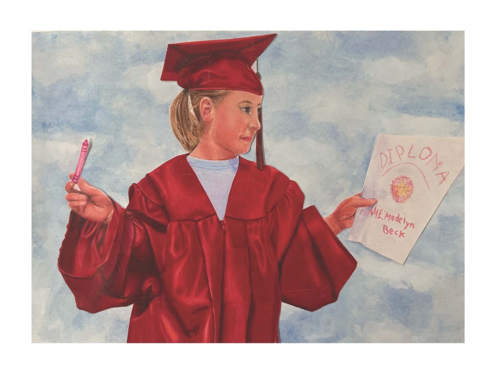 In regards to her artwork, Beck says, “Representing myself through bright colors and fluid lines filled me with joy. As I ventured through elementary, middle, and high school my love for art and design never faltered–it only grew. We are at our most creative state when we are young. As we grow older, our creativity can deplete as we begin to focus on reality and perfection. This piece captures the idea that art and creativity can remain despite the stressors of growing up–because we deserve the joys of art and design at every stage of our lives.”