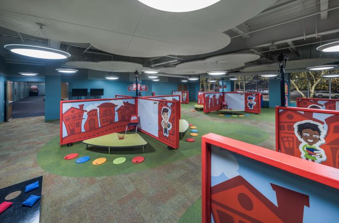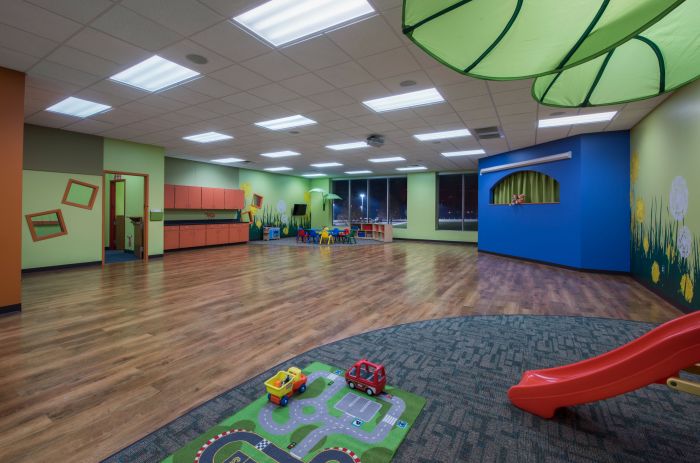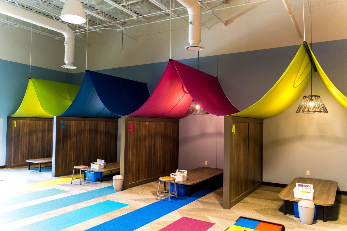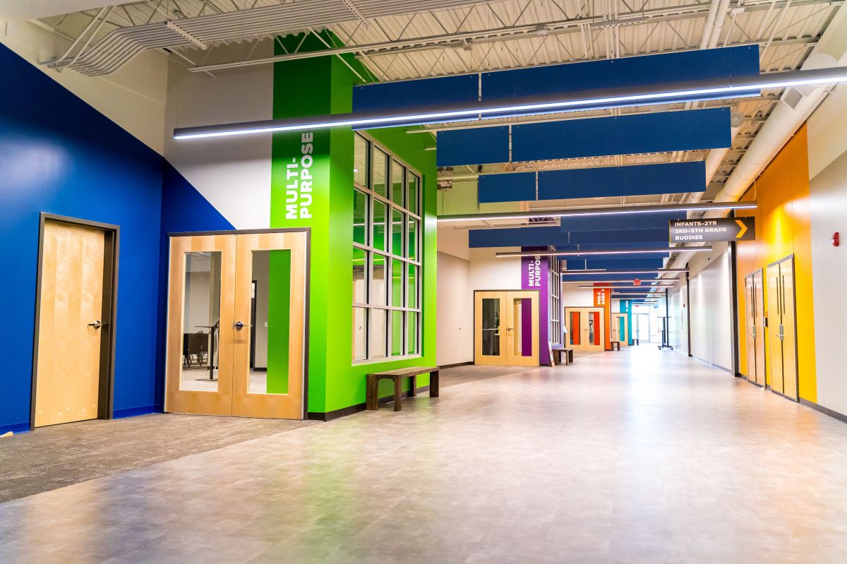 Bright colors differentiate the spaces by age group throughout the children’s wing. The colors serve as guideposts for parents and kids to ensure they’re going to the appropriate spaces.