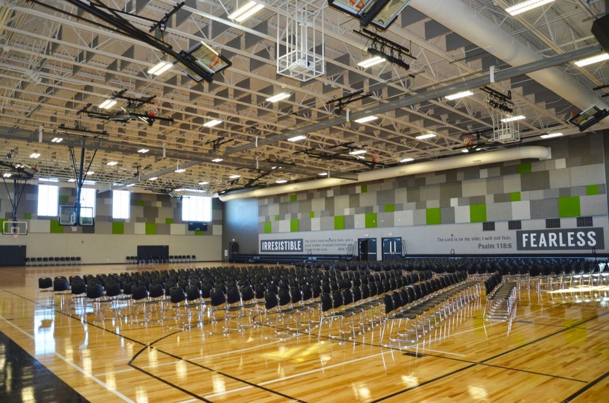 A new multi-purpose gymnasium provides a worship space for junior high youth as well as a multi-court configuration for various sports events. An existing gym was redesigned for worship, performance, and gathering for area high school youth and provides a much-needed venue for weddings.